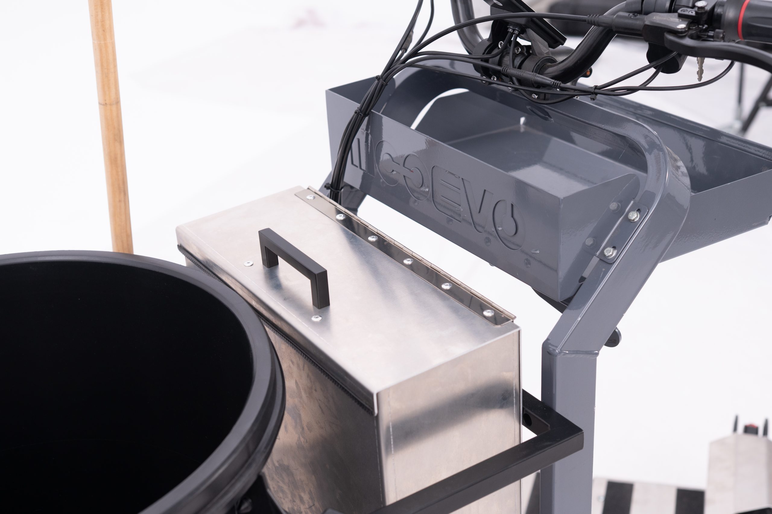 El sistema patentado de MOOEVO, permite combinar el uso mixto, como carro manual con asistencia eléctrica para ir andando, y el de patinete eléctrico, para transportar al operario en sus traslados entre zonas de trabajo.